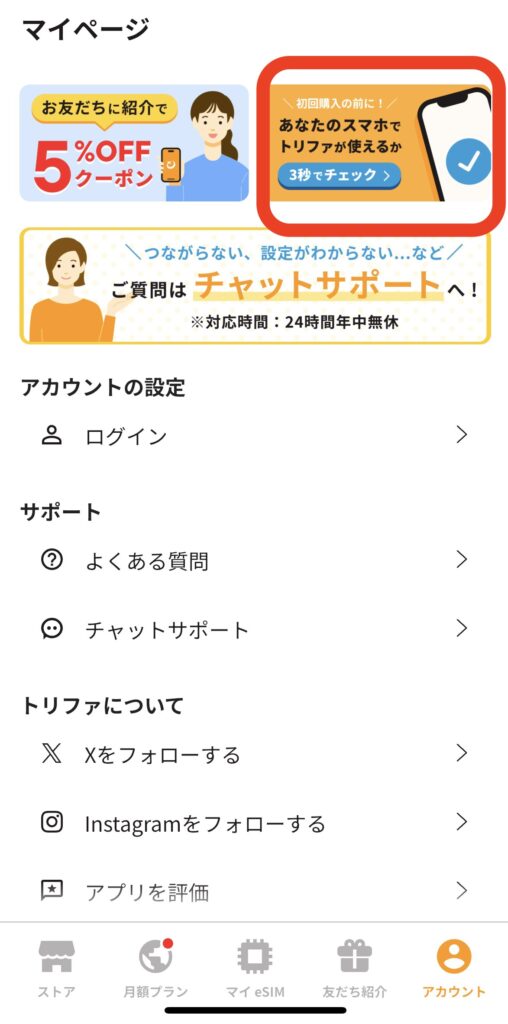 Trifa公式アプリには、端末がeSIMに対応しているかをすぐに確認できる診断機能があります。