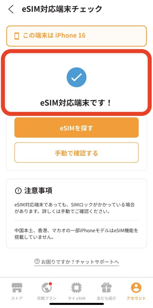 画面に「eSIM対応端末です!」と表示されればOKです。